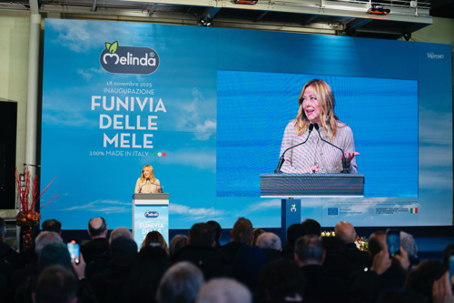 Il Presidente Meloni: “Questa è l'agricoltura che ci piace, dotata di visione, capace di proiettare le proprie radici nel futuro”È stata inaugurata martedì 18 novembre, in Val di Non, la prima funivia al mondo dedicata al trasporto della frutta. Presenti sul posto la premier Giorgia Meloni e il Ministro dell’Agricoltura Francesco Lollobrigida, nonché i soci e i dipendenti del Consorzio Melinda rappresentati dal Presidente Ernesto Seppi.